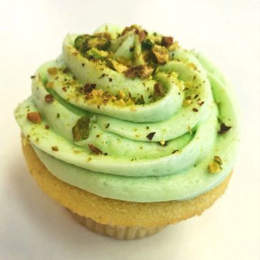 A vanilla cupcake filled with chocolate buttercream; iced with a whipped pistachio icing and sprinkled with chopped pistachios.