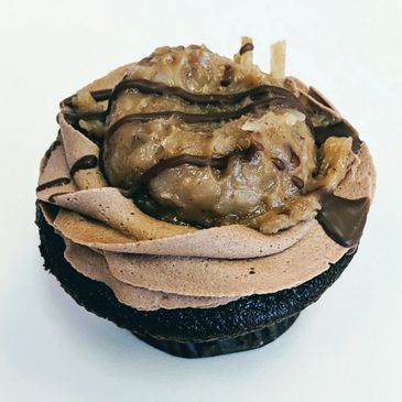 Our vanilla cupcake stuffed with an piece of mounds bar, frosted with coconut buttercream and topped with shredded coconut.