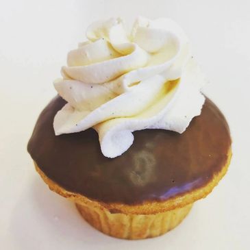Our chocolate cupcake filled with vanilla buttercream, dipped in ganache, and topped off with squiggle of vanilla buttercream.